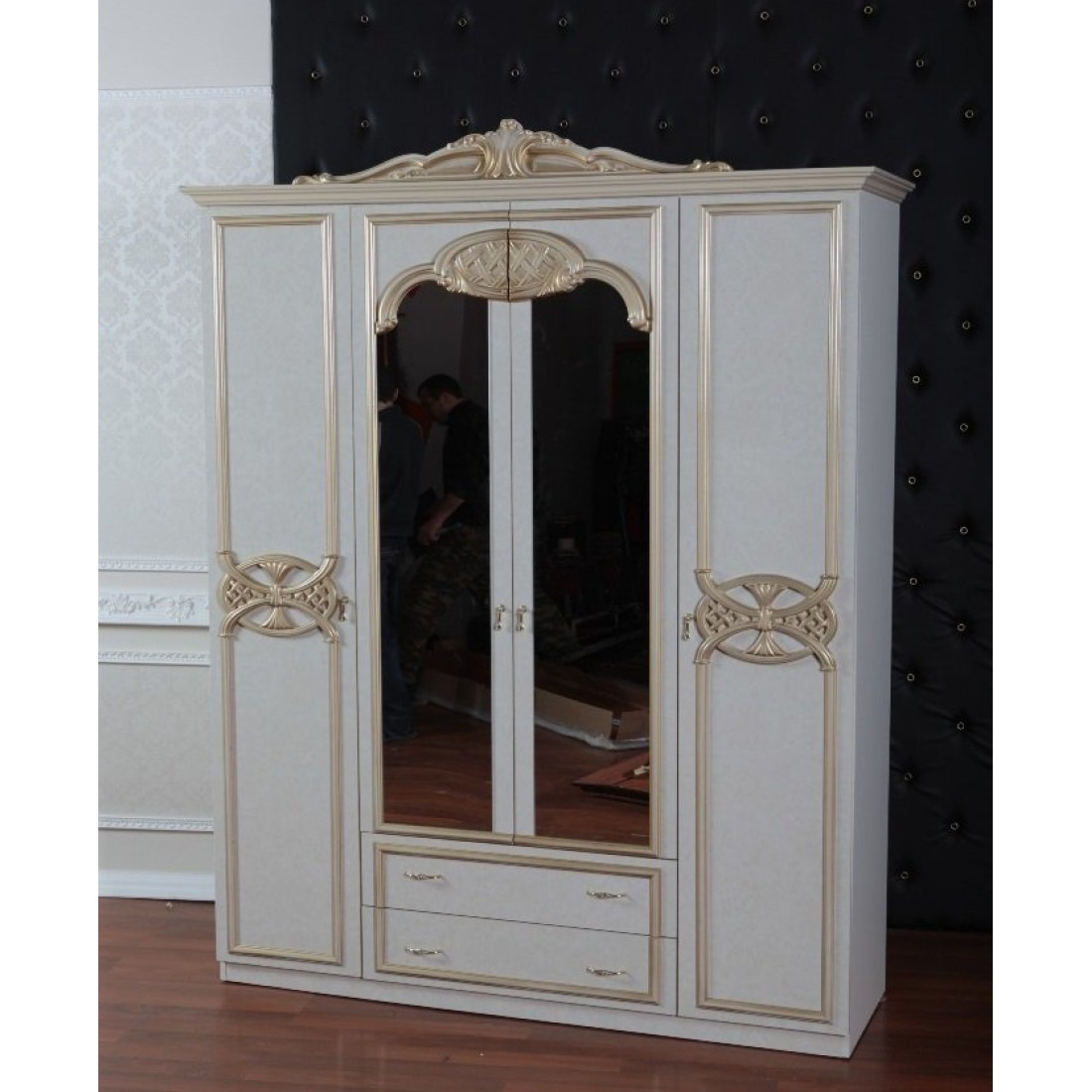 Четырехстворчатый шкаф Ольга (беж) от Российской фабрики «ДИА мебель» выполнен в элегантном бежевом цвете в сочетании с золотыми вставками и матовым покрытием. Помимо четырех открывающихся дверей шкаф имеет два выдвижных ящика, на роликах, обеспечивающих бесшумное и плавное выдвижение. Фасад шкафа украшен объемными, резными вставками. Коллекция "Ольга" подойдет для настоящих ценителей классического стиля.