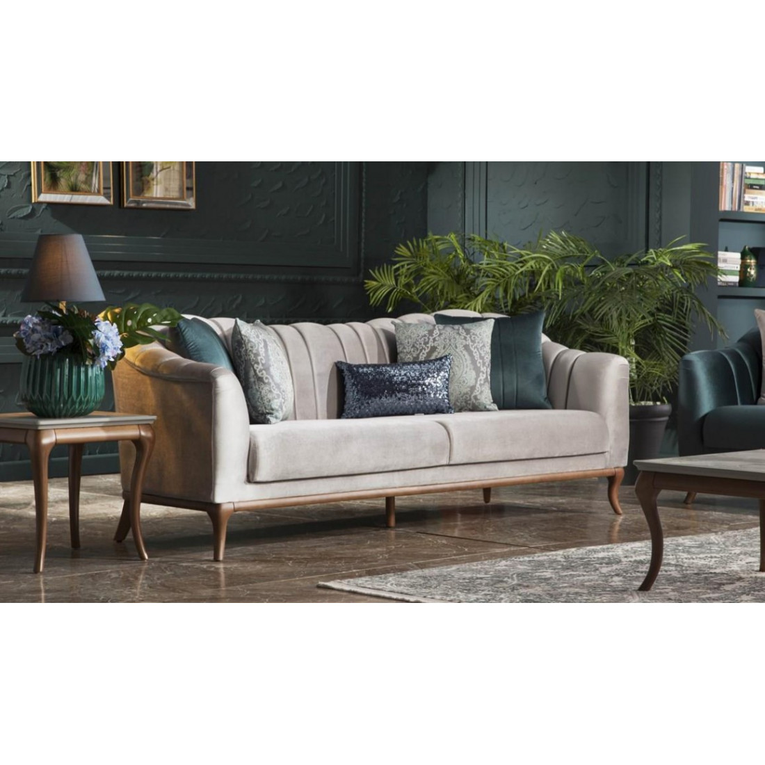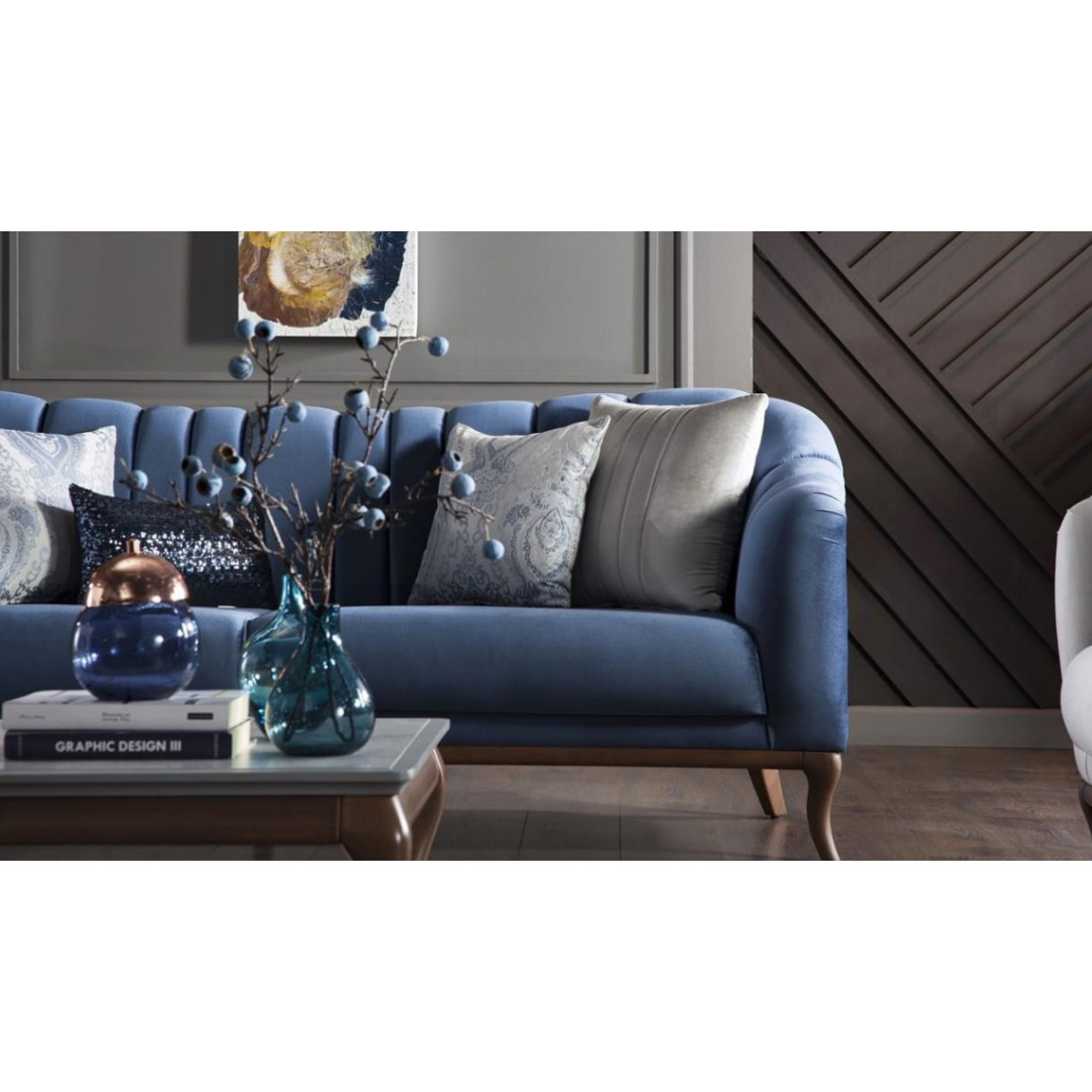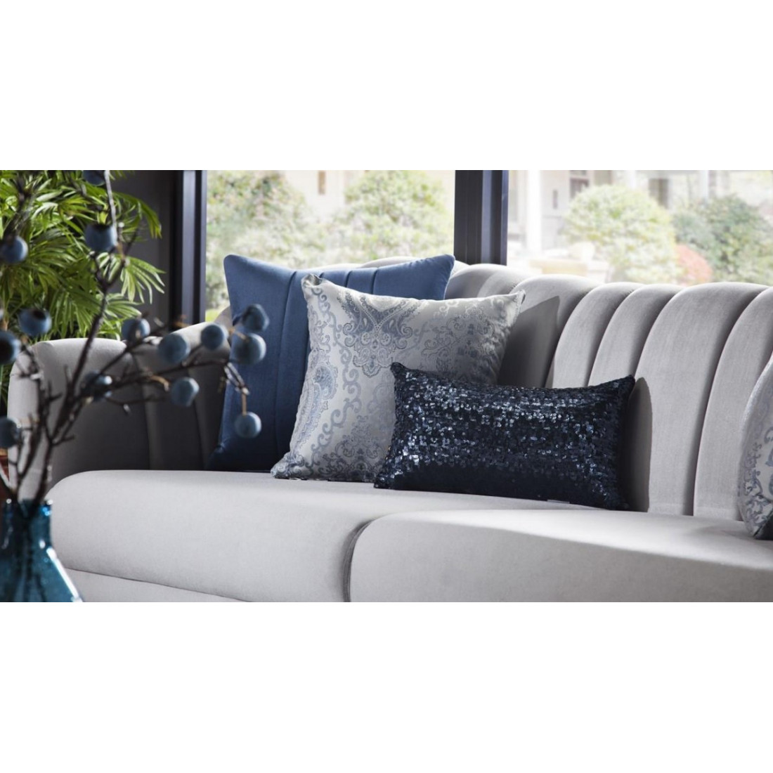 Идеальные вертикальные линии на спинке и подлокотниках выделяют трехместный диван из коллекции "Pesaro" среди конкурентов. Он представлен в нескольких цветовых вариантах: в синих, белых и фиолетовых тонах. В комплект входят пять разнообразных подушек, четыре из которых квадратные и одна маленькая прямоугольная. Высокие ножки, обрамлённые прекрасным декором с древесной текстурой, упростят уборку в доме. Ткань этого дивана невероятно мягкая и очень легко чистится